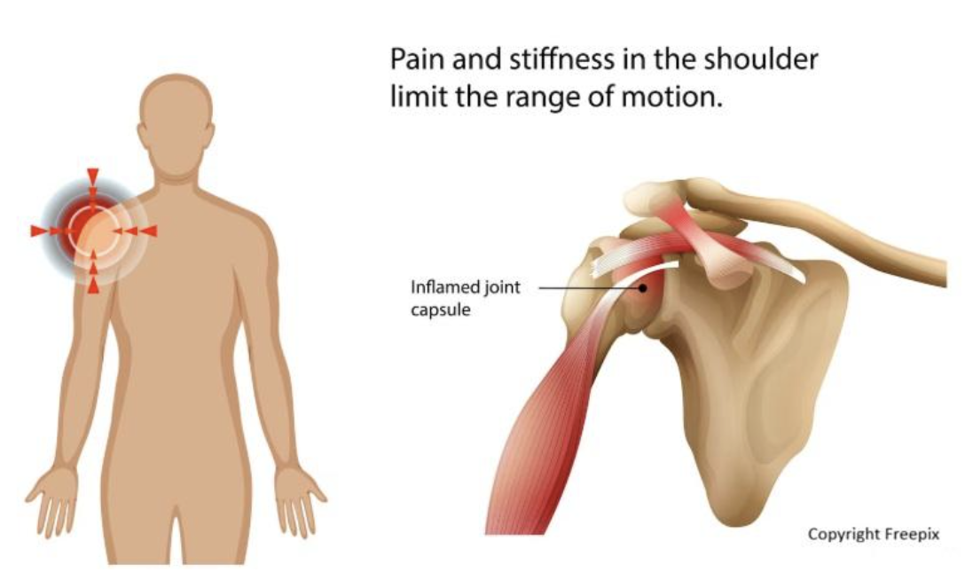 Freezing – painful, can be worse at night and progressive loss of shoulder movement lasting on average 2 to 9 months